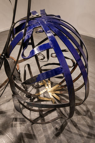 A single space containing two spheres. One large, with a rusted base, nearly filling the entire space, and the other small, positioned beside it. The two spheres create a solid presence of raw material, a heavy and oppressive mass. Even the air between the iron bars does not ease the feeling of suffocation.